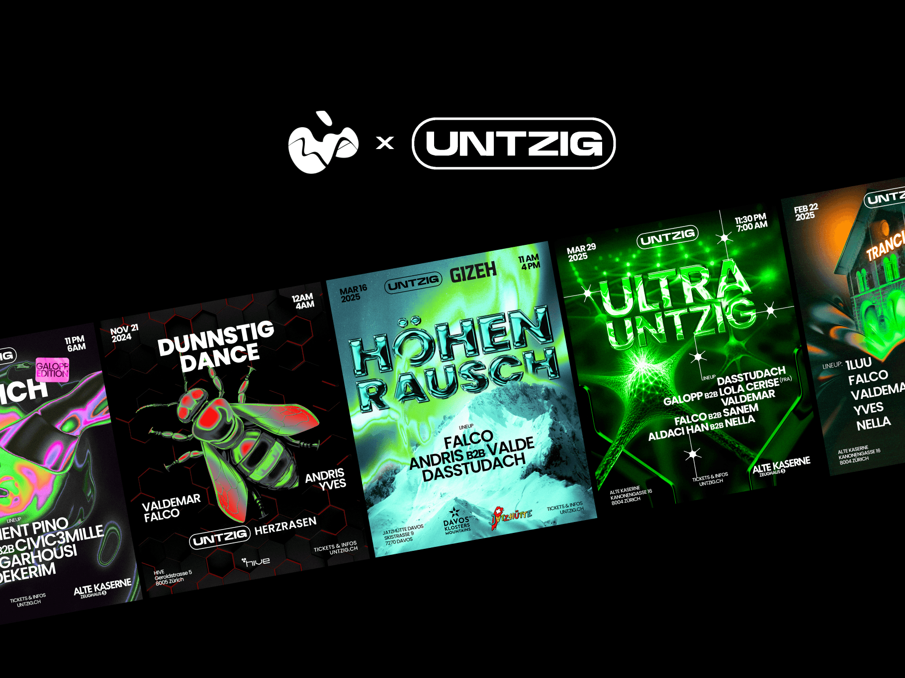 Party flyers for UNTZIG techno events